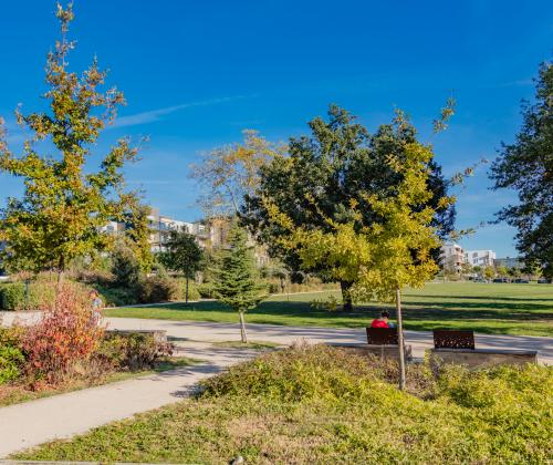 - Les espaces publics sont achevés : parc de 12 hectares, + de 4 500 arbres et 50 000 couvre sols, des bassins paysagers participant de la gestion de la ressource eau, de l’agrément et de la biodiversité ;