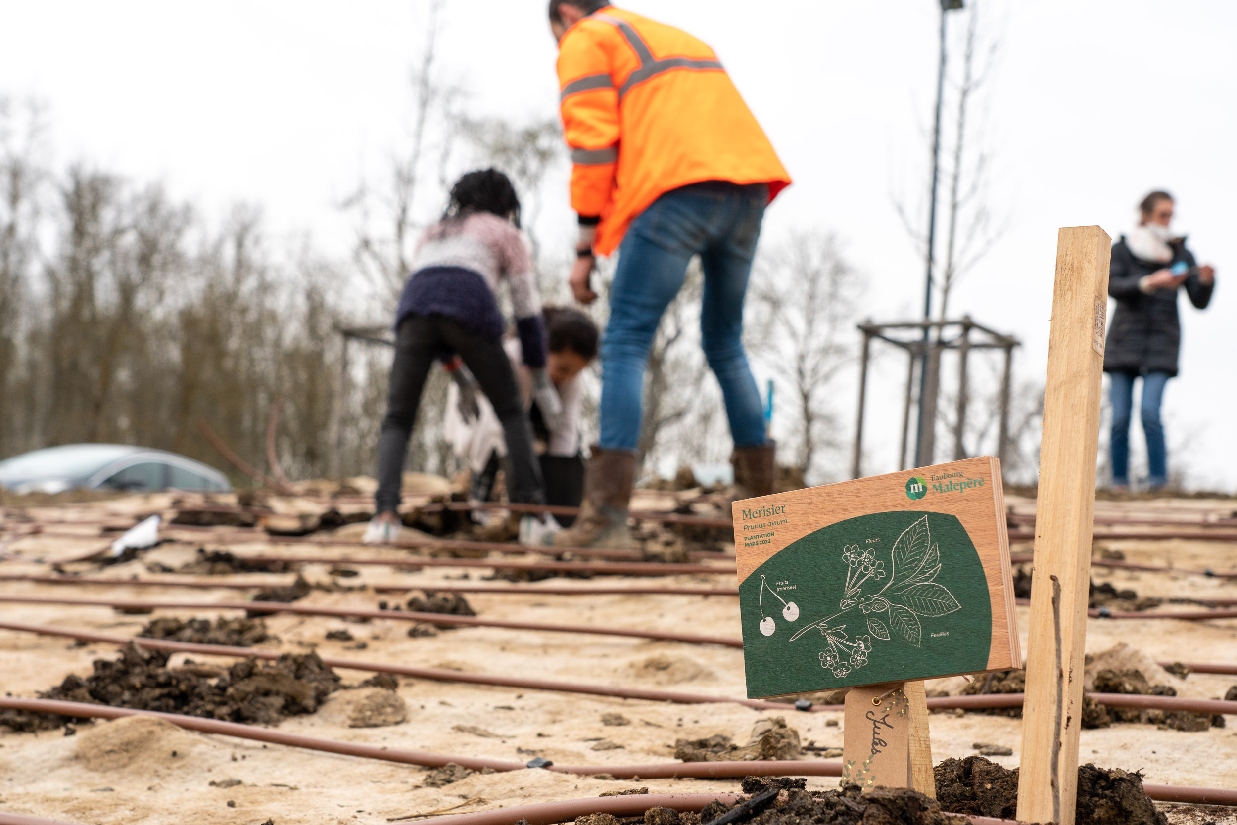 Pour améliorer le cadre de vie des habitants, futurs habitants et écoliers du Faubourg Malepère, Toulouse Métropole, la Mairie de Toulouse et Oppidea, aménageur du quartier, ont lancé la plantation de plus de 400 arbres en lisière du bois de l’Hers, à proximité du groupe scolaire Georges Mailhos, ce vendredi 18 mars 2022, en présence du maire de quartier, Emilion Esnault, de l'adjointe au maire de Toulouse en charge de l'Éducation et des politiques pour Bien Grandir, Marion Lalane de Laubadère, et de la paysagiste du projet, Julie Poirel.