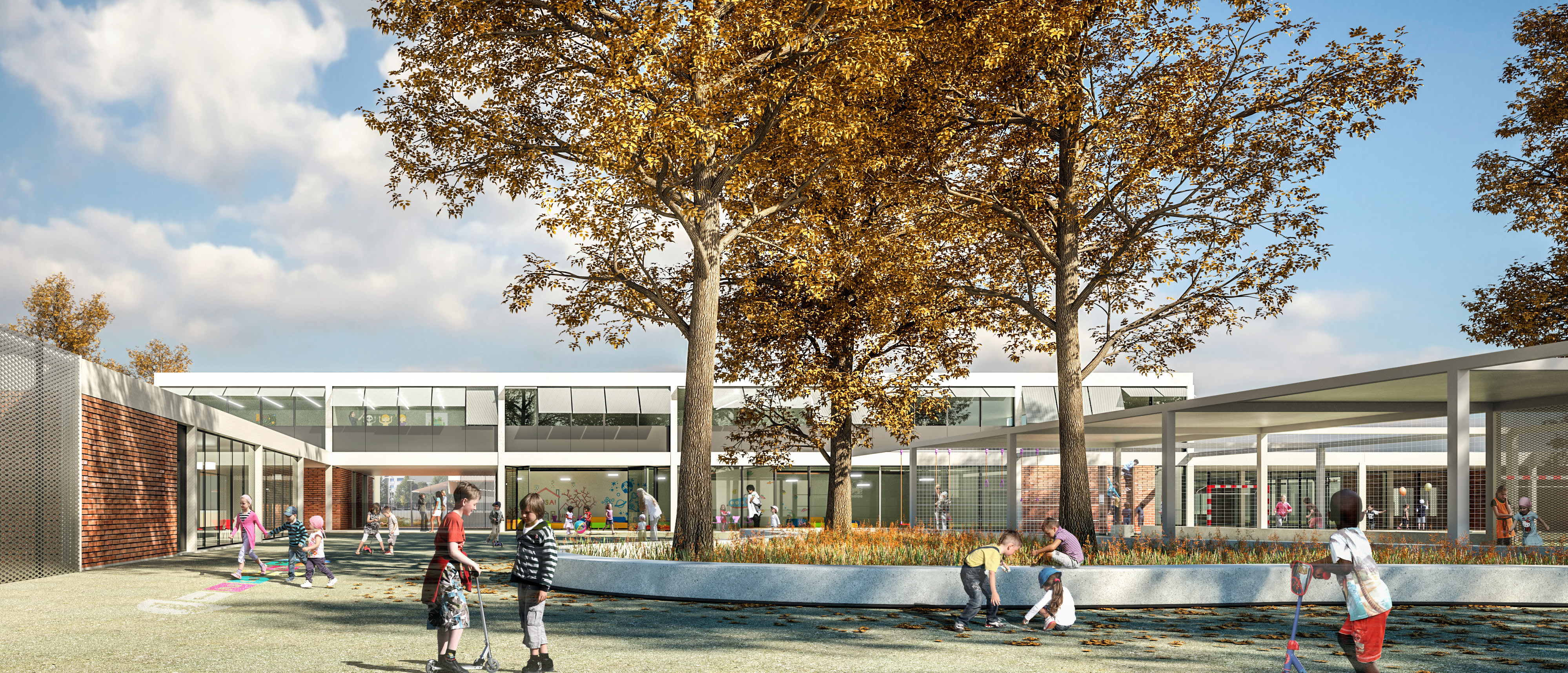 Les travaux d'espaces publics, réalisés par Oppidea, ont démarré dans le même temps, afin de desservir ce groupe scolaire dès sa livraison et son ouverture en septembre 2019.